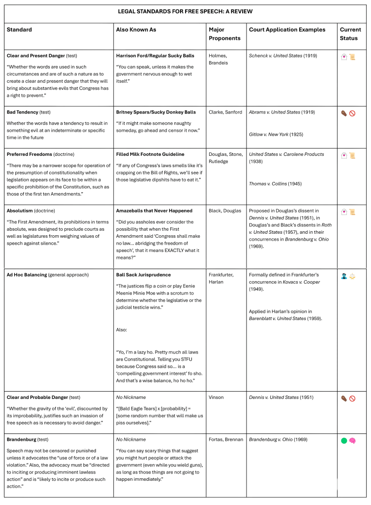 Don’t get me wrong. I’m all for free speech. And I’ll gladly join you in yelling racial epithets against big bad white people just for the hell of it. But the fact that the Brandenburg opinion turned free speech jurisprudence on its back—in a goddamn per curiam opinion short enough to be scribbled on a napkin, no less—makes me wonder if the Court just shot its constitutional load in a moment of doctrinal euphoria, then ghosted.